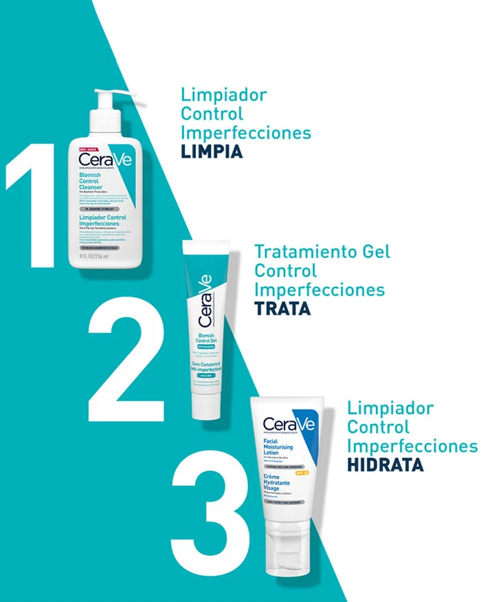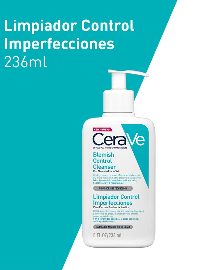 CERAVE BLEMISH CONTROL CLEANSER 236ML es un limpiador en gel transformador a espuma. Desobstruye poros y trata imperfecciones; reduce la oleosidad, mientras repara la barrera protectora de la piel. Formulado con Ácido Salicílico, Niacinamida y Ácido Hialurónico.