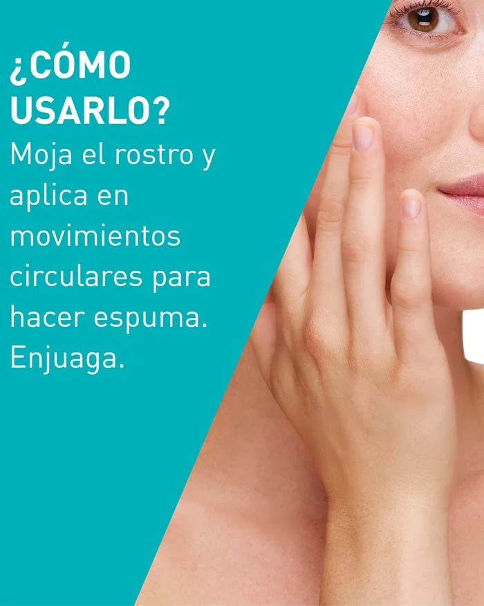 - Mojar el rostro, aplicar el producto hasta hacer espuma. Masajear sobre el rostro, evitando los ojos. Enjaguar bien.