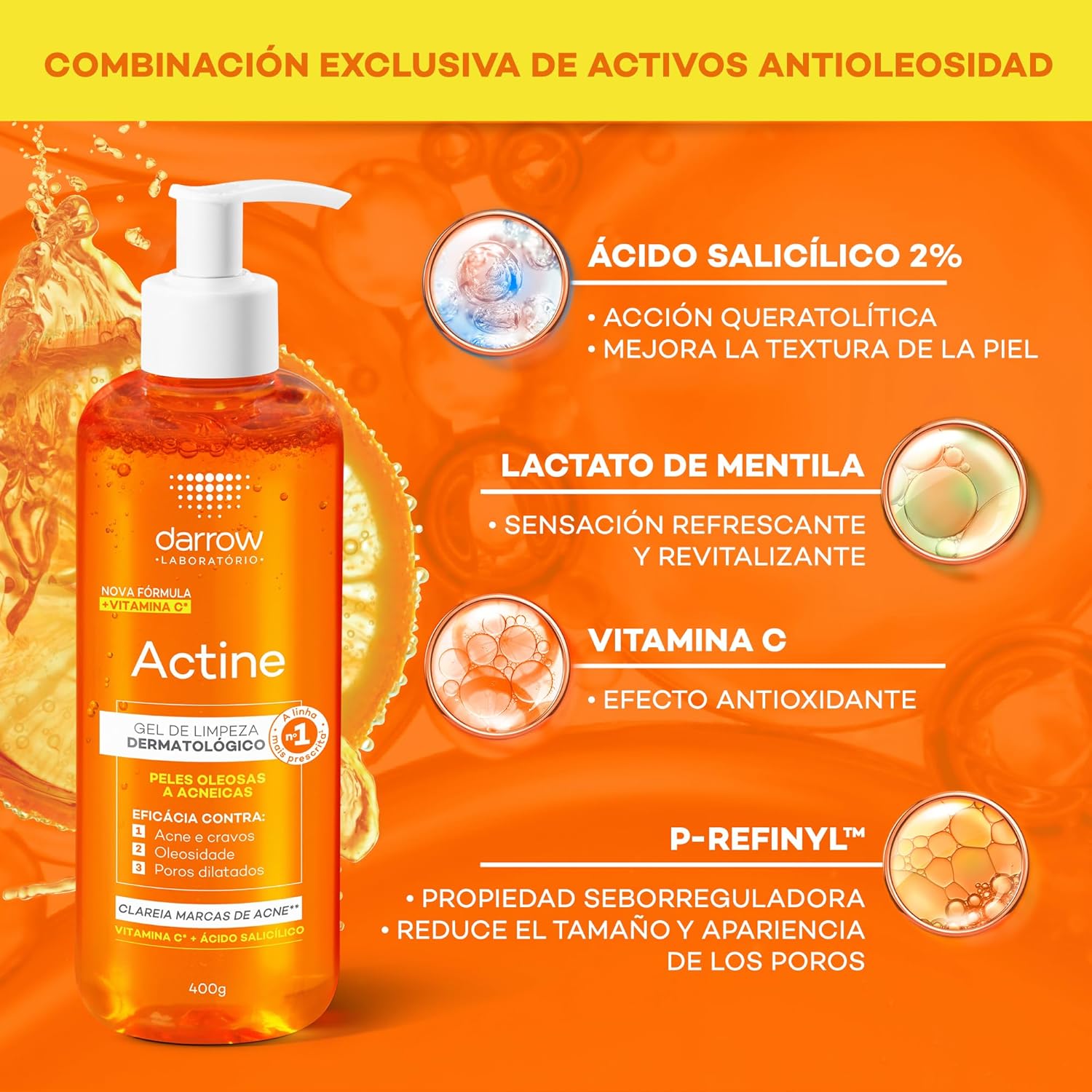 Darrow Actine Gel Limpiador 400 g es un limpiador dermatológico avanzado, formulado para pieles latinas grasas y con tendencia acneica. Su combinación de activos de alta eficacia ofrece resultados clínicos comprobados en solo 28 días: