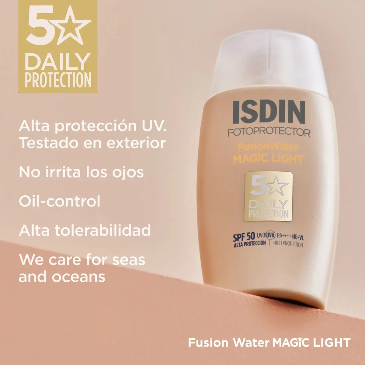 Fusion Water Color Light SPF 50 de Isdin es un protector solar facial ultraligero con color y acción antioxidante que protege, hidrata y unifica el tono de la piel. Aporta una cobertura natural con efecto buena cara, disimula imperfecciones y no irrita los ojos.